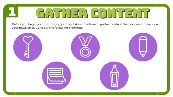 Before you begin your prompting journey, take some time to gather content that you want to include in your newsletter. Consider the following elements: