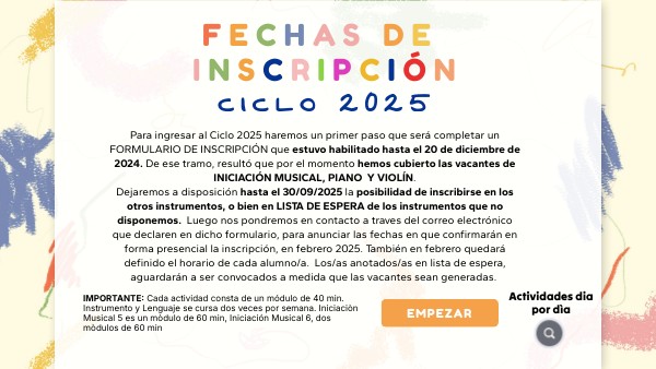 Para ingresar al Ciclo 2025 haremos un primer paso que será completar un FORMULARIO DE INSCRIPCIÓN que estuvo habilitado hasta el 20 de diciembre de 2024. De ese tramo, resultó que por el momento hemos cubierto las vacantes de INICIACIÓN MUSICAL, PIANO Y VIOLÍN. Dejaremos a disposición hasta el 30/09/2025 la posibilidad de inscribirse en los otros instrumentos, o bien en LISTA DE ESPERA de los instrumentos que no disponemos. Luego nos pondremos en contacto a traves del correo electrónico que declaren en dicho formulario, para anunciar las fechas en que confirmarán en forma presencial la inscripción, en febrero 2025. También en febrero quedará definido el horario de cada alumno/a. Los/as anotados/as en lista de espera, aguardarán a ser convocados a medida que las vacantes sean generadas.