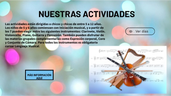 Las actividades están dirigidas a chicos y chicas de entre 5 a 12 años. Los niños de 5 y 6 años comienzan con Iniciación musical, y a partir de los 7 pueden elegir entre los siguientes instrumentos: Clarinete, Violín. Violoncello, Piano, Guitarra y Percusión. También pueden disfrutar de las materias grupales complementarias como Expresión corporal, Coro y Conjunto de Cámara. Para todos los instrumentos es obligatorio cursar Lenguaje Musical.