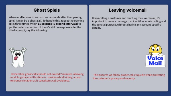 Remember, ghost calls should not exceed 2 minutes. Allowing a call to go beyond this time is considered call riding, a zero-tolerance violation as it constitutes call avoidance.