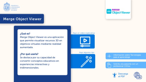 ¿Qué es? Merge Object Viewer es una aplicación que permite visualizar recursos 3D en objetivos virtuales mediante realidad aumentada. ¿Por qué usarla? Se destaca por su capacidad de convertir conceptos educativos en experiencias interactivas y tridimensionales.