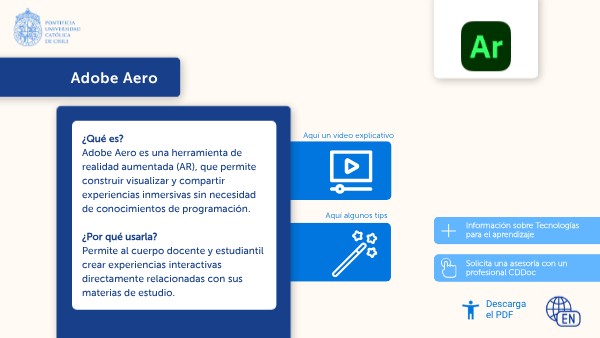 ¿Qué es? Adobe Aero es una herramienta de realidad aumentada (AR), que permite construir visualizar y compartir experiencias inmersivas sin necesidad de conocimientos de programación. ¿Por qué usarla? Permite al cuerpo docente y estudiantil crear experiencias interactivas directamente relacionadas con sus materias de estudio.