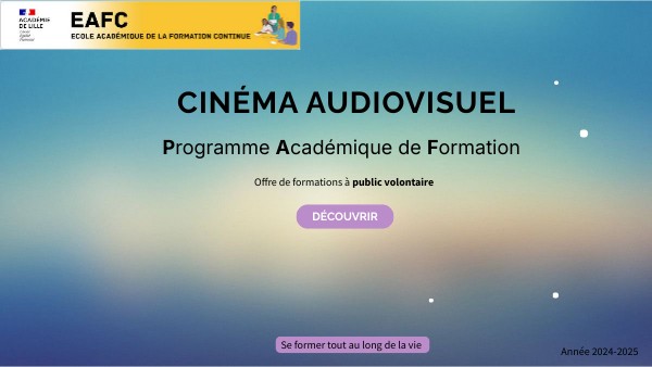 L'introduction de l'IA-IPR Le plan de formation pour l’enseignement du Cinéma-Audiovisuel de l’académie de Lille est ouvert aux professeurs de collège et de lycée qui enseignent le CIAV mais aussi à celles et ceux qui sont potentiellement intéressés par celui-ci. Sont donc offertes des formations multimodales de qualité qui mettent en lumière les caractéristiques et pratiques de cet enseignement artistique dont la popularité est croissante sur l’ensemble du territoire, et cela, dans une logique de parcours pour les élèves et de montée en compétences pour les professeurs.L’offre 2024/2025 propose une gamme qui se veut suffisamment large en matière de temporalité et de progressivité : informations et contenus pour le collège et le lycée, en lien avec les dispositifs, focus spécifiques sur la théorie et la pratique, des apports disciplinaires de haute tenue en lien avec les mutualisations pédagogiques pour l’enseignement de l’option et/ou de la spécialité en cycle terminal. Les formations proposées ont plusieurs objectifs afin de couvrir les besoins de terrain identifiés par l’inspection, les formateurs et les professeurs : informer les équipes sur les possibilités qui sont offertes en établissement et avec les partenaires, accompagner au niveau didactique et pédagogique les professeurs qui souhaiteraient présenter la certification et maintenir une solide dynamique de formation pour les professeurs en poste qui ont à cœur de se former tout au long de la carrière.
