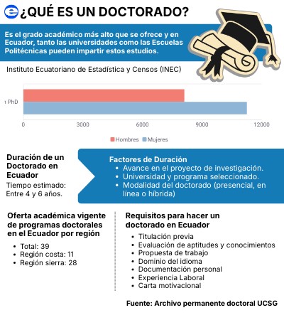 Es el grado académico más alto que se ofrece y en Ecuador, tanto las universidades como las Escuelas Politécnicas pueden impartir estos estudios.