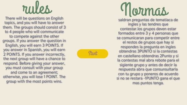 saldran preguntas de tematiaca de ingles y las tendres que contestar.los grupos deven estar formados entre 3 y 4 personas que se comunicaran para competir entre el restos de grupos que hay si respondes la pregunta en ingles obtendras 3PUNTO si la contestas en castellano obtendras 2Punto y si la contestas mal abra rebote para el sigiente grupo y antes de decir la respuesta abra que consunsultarla con tu grupo y poneros de acuerdo si no se restara -1PUNTO gana el que mas puntos tenga.
