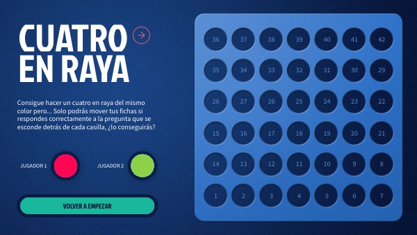Consigue hacer un cuatro en raya del mismo color pero... Solo podrás mover tus fichas si respondes correctamente a la pregunta que se esconde detrás de cada casilla, ¿lo conseguirás?