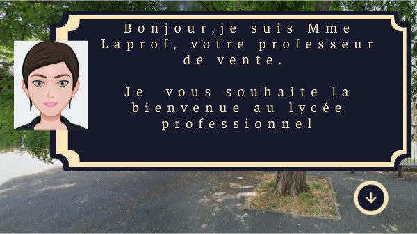Bonjour,je suis Mme Laprof, votre professeur de vente. Je vous souhaite la bienvenue au lycée professionnel