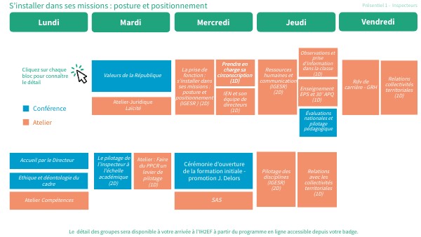 Ces ateliers, par champs disciplinaires ou de spécialités, visent à accompagner l’inspecteur dans sa prise de fonction en termes de posture et de positionnement. Animés par des inspecteurs généraux, il permet une installation durable dans les missions.