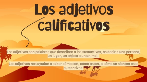 Los adjetivos son palabras que describen a los sustantivos, es decir a una persona, un lugar, un objeto o un animal. Los adjetivos nos ayudan a saber cómo son, cómo están, o cómo se sienten esos sustantivos.