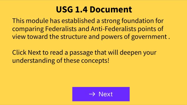 This module has established a strong foundation for comparing Federalists and Anti-Federalists points of view toward the structure and powers of government . Click Next to read a passage that will deepen your understanding of these concepts!
