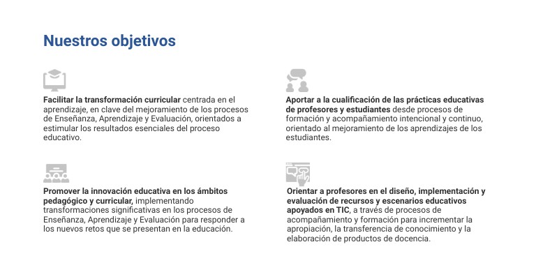Orientar a profesores en el diseño, implementación y evaluación de recursos y escenarios educativos apoyados en TIC, a través de procesos de acompañamiento y formación para incrementar la apropiación, la transferencia de conocimiento y la elaboración de productos de docencia.