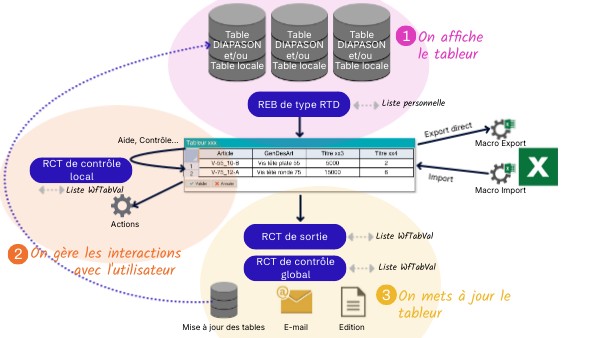 A la sortie du tableur, DIAPASON récupère toutes les données du tableur dans la liste WfTabVal. A partir de cette liste, on réalise les mises à jour d'entités et les actions en sortie de tableur ( éditions..)