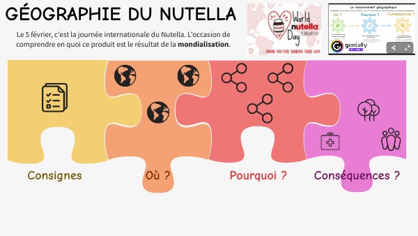 Le nutella est un produit commercial d'une marque italienne, Ferrero. Pourtant, c'est un produit mondialisé. C'est dans le monde que le nutella est fabriqué, transporté, vendu. Cette activité va te permettre de comprendre en quoi le nutella est un produit mondialisé. Pour cela, tu vas appliquer le raisonnement géographique à l'étude de ce produit mondialement connu. Si besoin, sers-toi des infographies à droite de l'activité pour repérer les trois étapes de ce raisonnement. COMMENT PROCÉDER ? Suis chacune des étapes du questionnaire, dans l'ordre. Lis bien attentivement les consignes et prends le temps de découvrir les documents. Ce travail est à effectuer en salle informatique : tu as le temps d'une seule séance pour compléter le questionnaire.