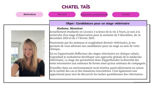 Actuellement étudiante en Licence 3 science de la vie à Tours, je suis à la recherche d’un stage d’observation pour la semaine du 9 décembre, du 16 decembre 2024 et du 17 février 2025. Passionnée par les animaux et soughaitant devenir vétérinaire, je me permets de vous adresser ma candidature pour un stage au sein de votre clinique. J'ai eu l'opportunité d'effectuer des stages véterinaire en clinique urbain. Cependant je souhaiterai develloper une approche globale de la médecine vétérinaire, ce stage me permettrait donc d’appréhender la diversité des soins nécessaires aux animaux de ferme ainsi qu’aux animaux de compagnie. Travailler dans un environnement rural m'attire particulièrement en raison de la variété des cas et des situations rencontrées. C’est également une opportinuté pour moi de découvrir les taches quotidiennes des véternaires.