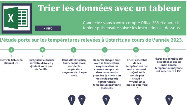 Reporter chaque mois avec sa température moyenne dans un classeur comportant deux colonnes (la première le « nom » du mois et la seconde comportant la température moyenne associée).