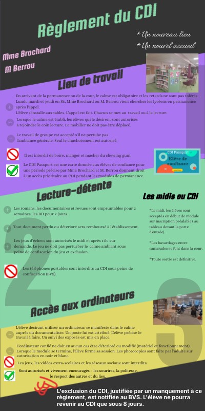 L'exclusion du CDI, justifiée par un manquement à ce règlement, est notifiée au BVS. L'élève ne pourra revenir au CDI que sous 8 jours.