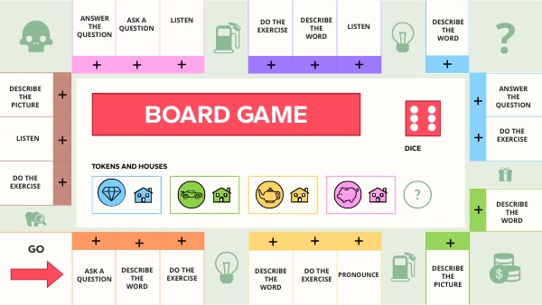 Each player must choose a color: blue, green, yellow or pink. He/she gets a tile to mark his/her position and 10 houses to indicate the properties he/she acquires during the game. Each player must take the tile of his/her color and place it on the starting square. To start playing, click on the dice and move your piece to the corresponding square. In each square there must be one or more questions. If you get it right, place one of your houses on that square - congratulations, you have a new property! Special squares: the squares with icons contain penalties such as "Player pays electricity tax: loses 2 houses". Get the question right to avoid the penalty! The player who has the highest number of houses on the board once all the squares are occupied wins.