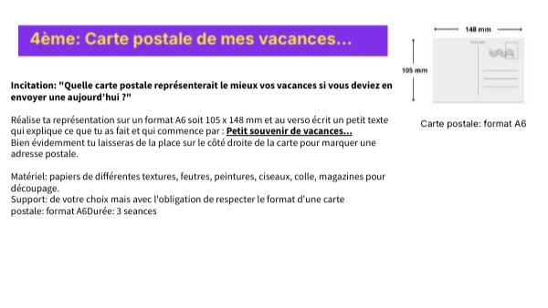 Incitation: "Quelle carte postale représenterait le mieux vos vacances si vous deviez en envoyer une aujourd’hui ?" Réalise ta représentation sur un format A6 soit 105 x 148 mm et au verso écrit un petit texte qui explique ce que tu as fait et qui commence par : Petit souvenir de vacances... Bien évidemment tu laisseras de la place sur le côté droite de la carte pour marquer une adresse postale. Matériel: papiers de différentes textures, feutres, peintures, ciseaux, colle, magazines pour découpage. Support: de votre choix mais avec l'obligation de respecter le format d'une carte postale: format A6Durée: 3 seances