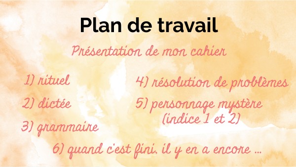 1) Sur une feuille de classeur, réalise ton défi-écriture. 2) Ecris ton prénom et le titre de ton défi. 3) Une fois ton travail terminé, pose ta feuille dans la banette "travail terminé" pour que ton travail soit corrigé. 4) Une fois corrigé, tu devras corriger tes erreurs et / ou recopier ton travail dans ton cahier d'écrivain.