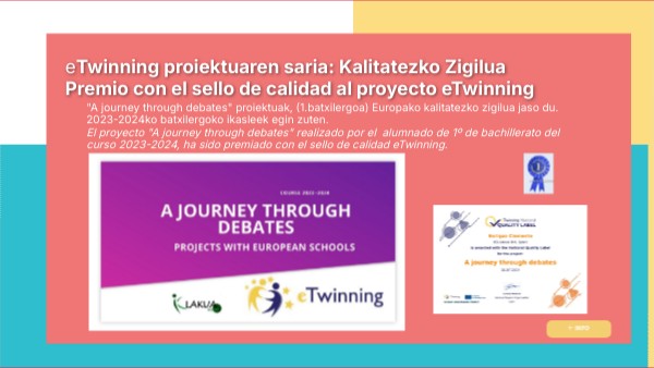 "A journey through debates" proiektuak, (1.batxilergoa) Europako kalitatezko zigilua jaso du. 2023-2024ko batxilergoko ikasleek egin zuten. El proyecto "A journey through debates" realizado por el alumnado de 1º de bachillerato del curso 2023-2024, ha sido premiado con el sello de calidad eTwinning.