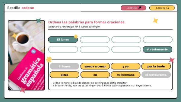 Ordne kortene slik at de danner en setning med riktig struktur. Når du er ferdig, kan du se løsningen ved å klikke på knappen øverst i høyre hjørne.