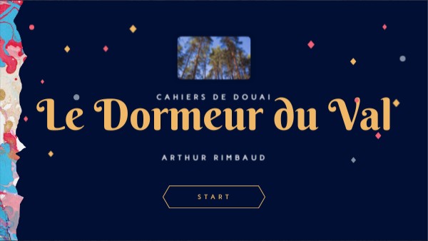 Durant son adolescence, Arthur Rimbaud fait de nombreuses fugues, qui vont lui inspirer l'écriture de certains des poèmes qui composent les Cahiers de Douai.C'est le cas du poème "Le Dormeur du val", écrit en 1870 : lors d'une escapade durant la guerre franco—prussienne, le poète se retrouve face au cadavre d'un soldat dans une nature magnifique. Rimbaud écrit donc ce sonnet (2 quatrains et 2 tercets en alexandrins) suite à une expérience personnelle.