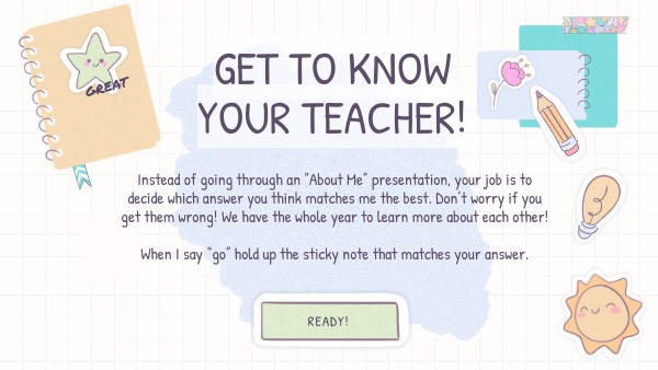 Instead of going through an "About Me" presentation, your job is to decide which answer you think matches me the best. Don’t worry if you get them wrong! We have the whole year to learn more about each other! When I say “go” hold up the sticky note that matches your answer.