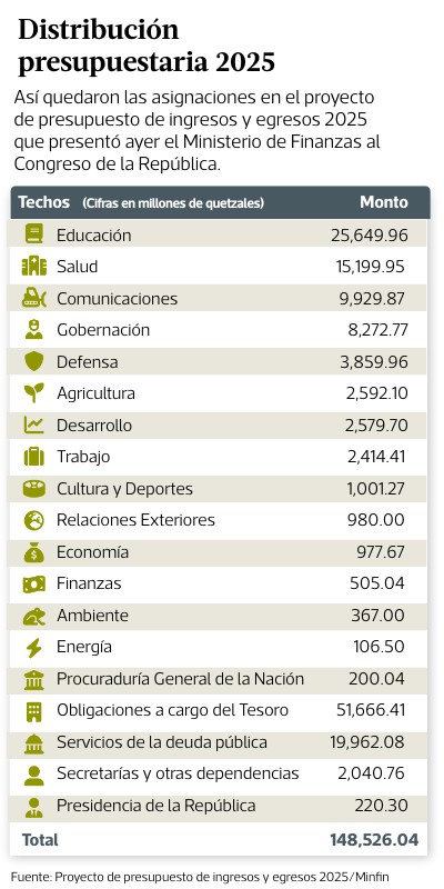 Así quedaron las asignaciones en el proyecto de presupuesto de ingresos y egresos 2025 que presentó ayer el Ministerio de Finanzas al Congreso de la República.