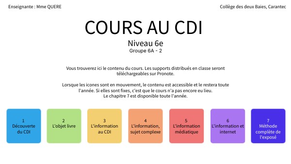 1) Présentation de l'enseignante et des élèves 2) Présentation du cours et des attendus 3) Présentation de l'espace CDI