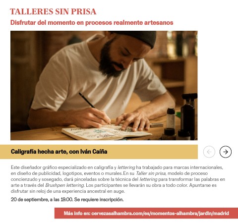 Este diseñador gráfico especializado en caligrafía y lettering ha trabajado para marcas internacionales, en diseño de publicidad, logotipos, eventos o murales. En su Taller sin prisa, modelo de proceso concienzudo y sosegado, dará pinceladas sobre la técnica del lettering para transformar las palabras en arte a través del Brushpen lettering. Los participantes se llevarán su obra a todo color. Apuntarse es disfrutar sin reloj de una experiencia ancestral en auge.