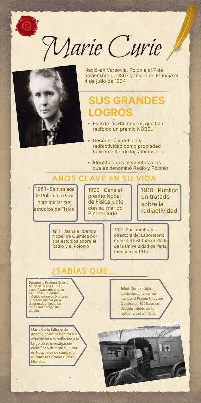 Durante la Primera Guerra Mundial, Marie Curie trabajó para desarrollar pequeñas unidades móviles de rayos X que se pudieran utilizar para diagnosticar lesiones cerca del campo de batalla.