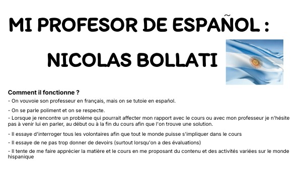 - Il tente de me faire apprécier la matière et le cours en me proposant du contenu et des activités variées sur le monde hispanique