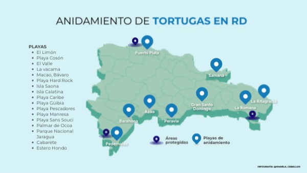 Especie predominante: Chelonia mydas (Verde) Eretmochelys imbricata (Carey) Temporada de anidamiento: Junio / Noviembre