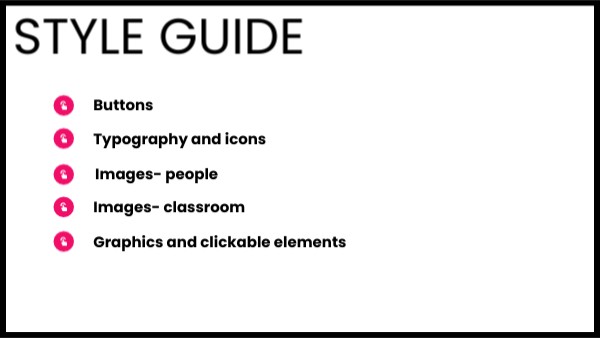Captions, subjeadings, main body text, enabled icons for menu/content slides, monochromatic graphics (active/unvisited)