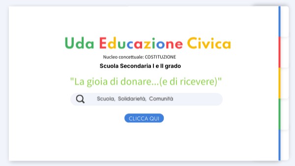 L'unità di Apprendimento "La gioia di donare... (e di ricevere)" parla di carità e solidarietà verso le persone più bisognose presenti nel nostro territorio. Questa UdA segue le linee guida per l'insegnamento dell'Educazione Civica, promuovendo valori fondamentali che ci uniscono e ci rendono più forti insieme.