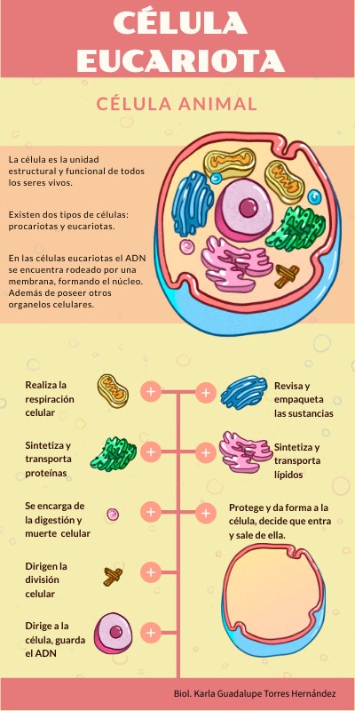 La célula es la unidad estructural y funcional de todos los seres vivos. Existen dos tipos de células: procariotas y eucariotas. En las células eucariotas el ADN se encuentra rodeado por una membrana, formando el núcleo. Además de poseer otros organelos celulares.