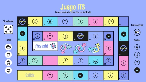 Partiendo desde la casilla de salida, tendréis que ir tirando el dado y respondiendo a todas las preguntas. Cuando la respuesta sea incorrecta, pasará vuestro turno y tendréis que pensarlo para más tarde. El equipo ganador será el que consiga llegar a la casilla de llegada. ¡Mucha suerte!