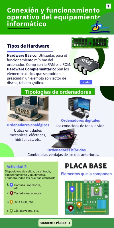 Hardware Básico: Utilizadas para el funcionamiento mínimo del ordenador. Como son la RAM o la ROM. Hardware Complementario: Son los elementos de los que se podrían prescindir. un ejemplo son lector de discos, tableta gráfica.