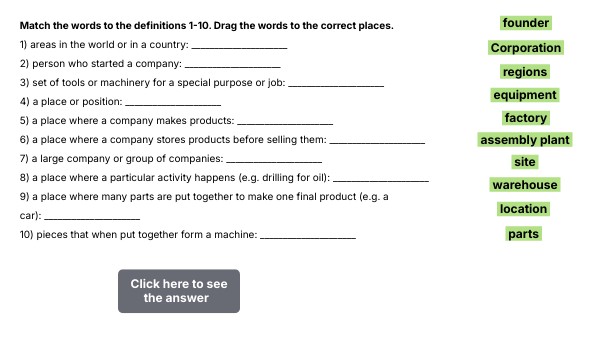 Match the words to the definitions 1-10. Drag the words to the correct places. 1) areas in the world or in a country: _____________________ 2) person who started a company: _____________________ 3) set of tools or machinery for a special purpose or job: _____________________ 4) a place or position: _____________________ 5) a place where a company makes products: _____________________ 6) a place where a company stores products before selling them: _____________________ 7) a large company or group of companies: _____________________ 8) a place where a particular activity happens (e.g. drilling for oil): _____________________ 9) a place where many parts are put together to make one final product (e.g. a car): _____________________ 10) pieces that when put together form a machine: _____________________
