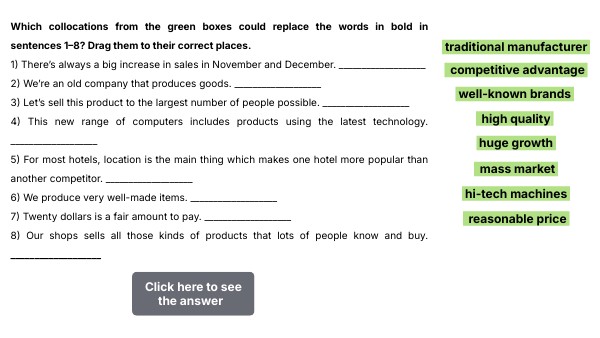 Which collocations from the green boxes could replace the words in bold in sentences 1–8? Drag them to their correct places. 1) There’s always a big increase in sales in November and December. ___________________ 2) We’re an old company that produces goods. ___________________ 3) Let’s sell this product to the largest number of people possible. ___________________ 4) This new range of computers includes products using the latest technology. ___________________ 5) For most hotels, location is the main thing which makes one hotel more popular than another competitor. ___________________ 6) We produce very well-made items. ___________________ 7) Twenty dollars is a fair amount to pay. ___________________ 8) Our shops sells all those kinds of products that lots of people know and buy. ___________________