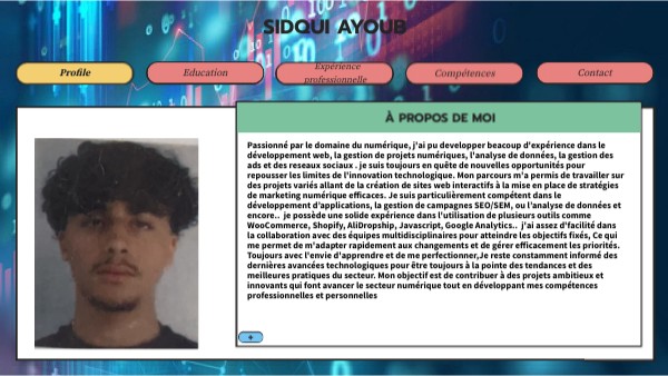 Passionné par le domaine du numérique, j'ai pu developper beacoup d'expérience dans le développement web, la gestion de projets numériques, l'analyse de données, la gestion des ads et des reseaux sociaux . je suis toujours en quête de nouvelles opportunités pour repousser les limites de l'innovation technologique. Mon parcours m'a permis de travailler sur des projets variés allant de la création de sites web interactifs à la mise en place de stratégies de marketing numérique efficaces. Je suis particulièrement compétent dans le développement d’applications, la gestion de campagnes SEO/SEM, ou l’analyse de données et encore.. je possède une solide expérience dans l'utilisation de plusieurs outils comme WooCommerce, Shopify, AliDropship, Javascript, Google Analytics.. j'ai assez d'facilité dans la collaboration avec des équipes multidisciplinaires pour atteindre les objectifs fixés, Ce qui me permet de m'adapter rapidement aux changements et de gérer efficacement les priorités. Toujours avec l'envie d'apprendre et de me perfectionner,Je reste constamment informé des dernières avancées technologiques pour être toujours à la pointe des tendances et des meilleures pratiques du secteur. Mon objectif est de contribuer à des projets ambitieux et innovants qui font avancer le secteur numérique tout en développant mes compétences professionnelles et personnelles