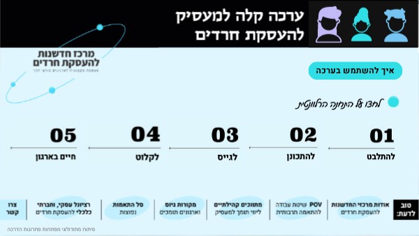 ערכה אינטרנטית זו מונגשת לשימוש המעסיק, ומהווה תמצות פרקטי של התובנות, הכלים והשיטות שנלמדו ונאספו במהלך מתן המעטפת לחברות על ידי מרכזי החדשנות להעסקת חרדים.