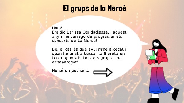 Hola! Em dic Larissa Oblidadisssa, i aquest any m'encarrego de programar els concerts de La Mercè! Bé, el cas és que avui m'he aixecat i quan he anat a buscar la llibreta on tenia apuntats tots els grups... ha desaparegut! No sé on pot ser...