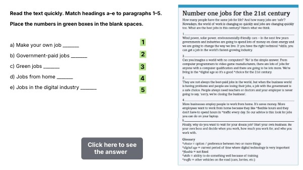 Read the text quickly. Match headings a–e to paragraphs 1–5. Place the numbers in green boxes in the blank spaces. a) Make your own job _______ b) Government-paid jobs _______ c) Green jobs _______ d) Jobs from home _______ e) Jobs in the digital industry _______