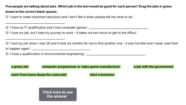 Five people are talking about jobs. Which job in the text would be good for each person? Drag the jobs in grees boxes to the correct blank spaces. 1) ‘I want to make important decisions and I don’t like it when people tell me what to do.’ __________________________________________ 2) ‘I have an IT qualification and I love computer games.’ __________________________________________ 3) ‘I love my job, but I hate my journey to work – it takes me two hours to get to the office.’ __________________________________________ 4) ‘I lost my job when I was 28 and it took six months for me to find another one – it was horrible and I never want that to happen again.’ __________________________________________ 5) ‘I have a qualification in environmental engineering.’ __________________________________________