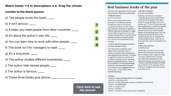 Match books 1–4 to descriptions a–k. Drag the chosen number to the blank spaces. a) Two people wrote this book: _____ b) It isn’t serious: _____ c) It helps you meet people from other countries: _____ d) It’s about the author’s own life: _____ e) You can learn how to work with other people: _____ f) This book isn’t for managers to read: _____ g) It’s a long book: _____ h) The author studied different businesses: _____ i) The author interviewed people:_____ j) The author is famous: _____ k) These three books give advice: _____, _____, _____