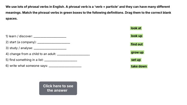 We use lots of phrasal verbs in English. A phrasal verb is a ‘verb + particle’ and they can have many different meanings. Match the phrasal verbs in green boxes to the following definitions. Drag them to the correct blank spaces. 1) learn / discover: _______________________ 2) start (a company): _______________________ 3) study / analyse: _______________________ 4) change from a child to an adult: _______________________ 5) find something in a list: _______________________ 6) write what someone says: _______________________