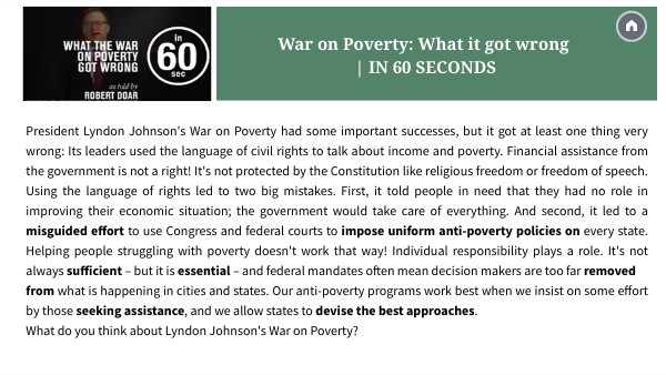 President Lyndon Johnson's War on Poverty had some important successes, but it got at least one thing very wrong: Its leaders used the language of civil rights to talk about income and poverty. Financial assistance from the government is not a right! It's not protected by the Constitution like religious freedom or freedom of speech. Using the language of rights led to two big mistakes. First, it told people in need that they had no role in improving their economic situation; the government would take care of everything. And second, it led to a misguided effort to use Congress and federal courts to impose uniform anti-poverty policies on every state. Helping people struggling with poverty doesn't work that way! Individual responsibility plays a role. It's not always sufficient – but it is essential – and federal mandates often mean decision makers are too far removedfrom what is happening in cities and states. Our anti-poverty programs work best when we insist on some effort by those seeking assistance, and we allow states to devise the best approaches.What do you think about Lyndon Johnson's War on Poverty?