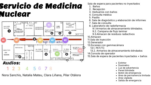 9.1.Armarios de almacenamiento blindados. 9.2. Campana de flujo laminar 9.3.Almacen de residuos radiactivos 10.Almacen 11.Sala de inyección 12.Generador 13.Escaneo con gammacámara 13.1. PET/TC 13.2. Armarios de almacenamiento blindados 14.Consola de operador 15.Sala de espera de pacientes inyectados + bañosServicio de Medicina Nuclear