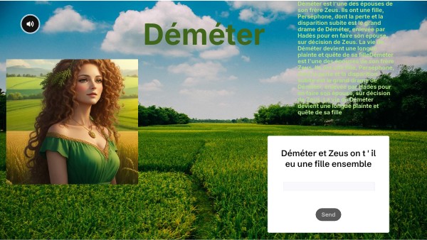 Déméter est l'une des épouses de son frère Zeus. Ils ont une fille, Perséphone, dont la perte et la disparition subite est le grand drame de Déméter, enlevée par Hadès pour en faire son épouse, sur décision de Zeus. La vie de Déméter devient une longue plainte et quête de sa filleDéméter est l'une des épouses de son frère Zeus. Ils ont une fille, Perséphone, dont la perte et la disparition subite est le grand drame de Déméter, enlevée par Hadès pour en faire son épouse, sur décision de Zeus. La vie de Déméter devient une longue plainte et quête de sa fille